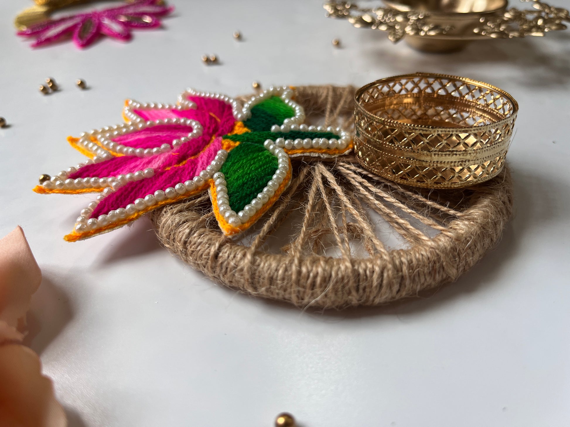 Bring elegance and tradition to your festive décor with our Lotus Bloom Tea Light Holder. Handcrafted with natural jute and adorned with a vibrant pink lotus motif outlined in pearls, this piece beautifully blends rustic charm with intricate artistry. The golden holder is perfect for tea lights or small diyas, making it a stunning centerpiece for Diwali, weddings, or home décor.