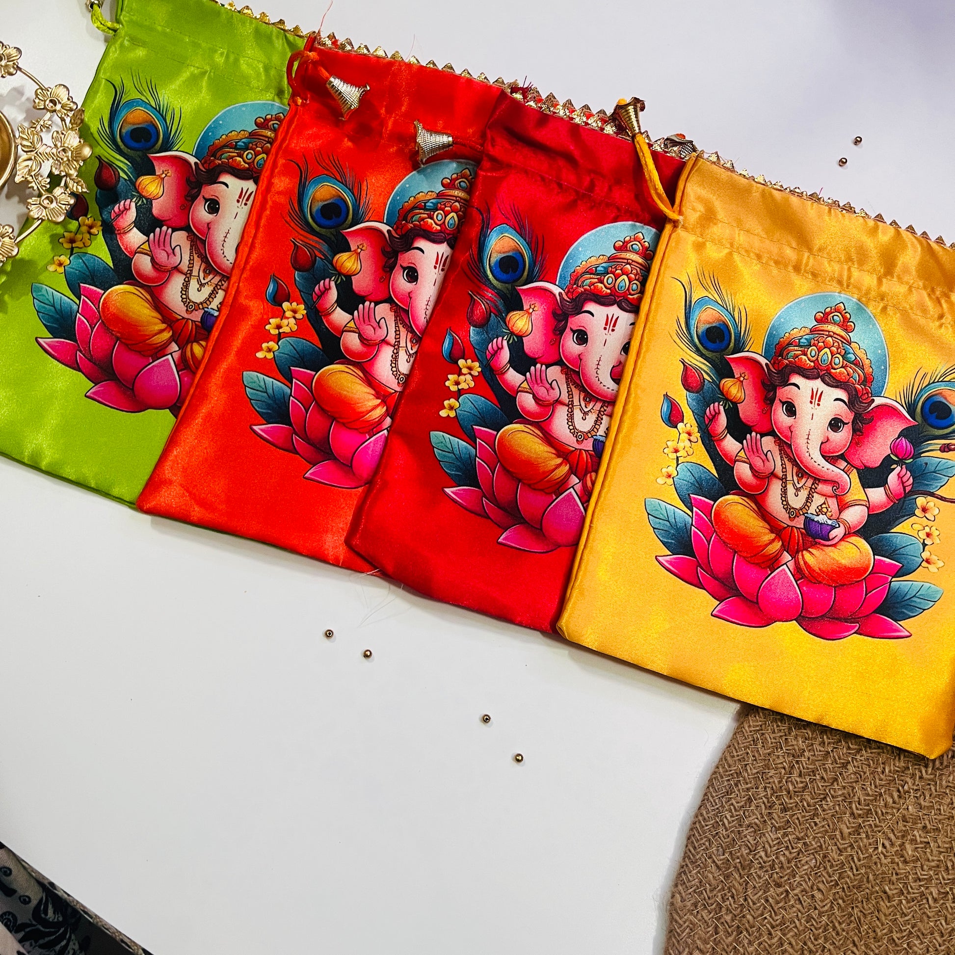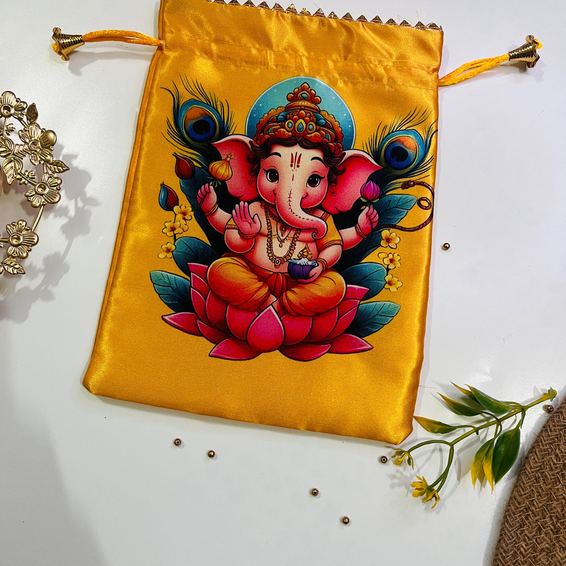 A vibrant satin potli bag featuring Lord Ganesha seated on a lotus, symbolizing prosperity and blessings. Perfect for pooja essentials, gifting, and festive celebrations.